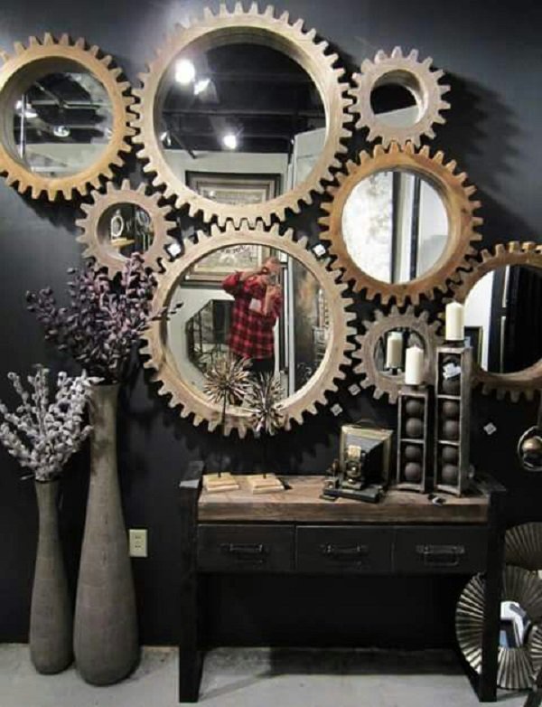 These is very bold arrangement of the wall in the hallway or living room. The gears are actually a mirror frame. A wall arranged in this way definitely returns to history.